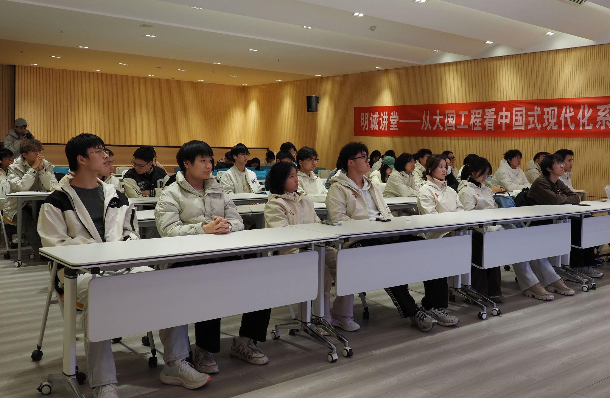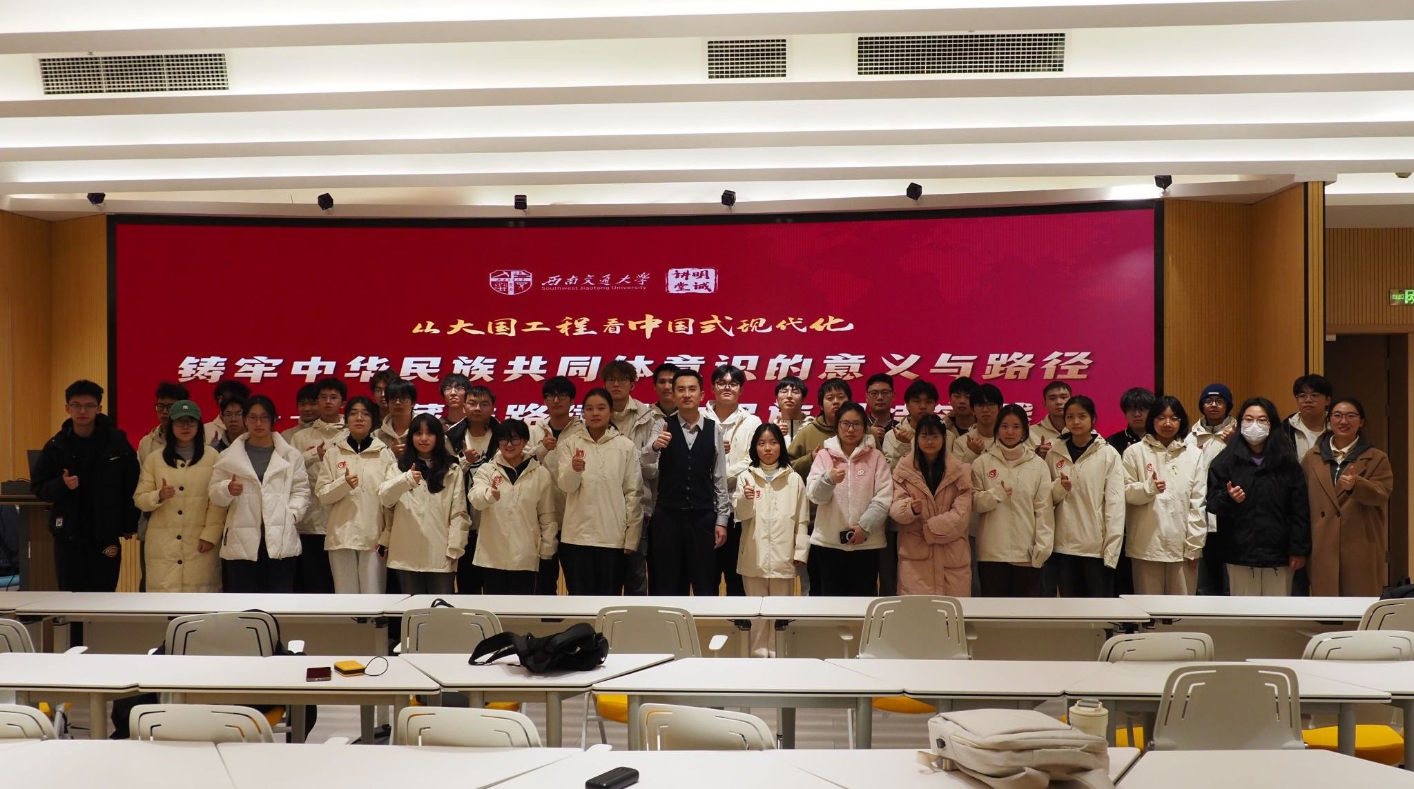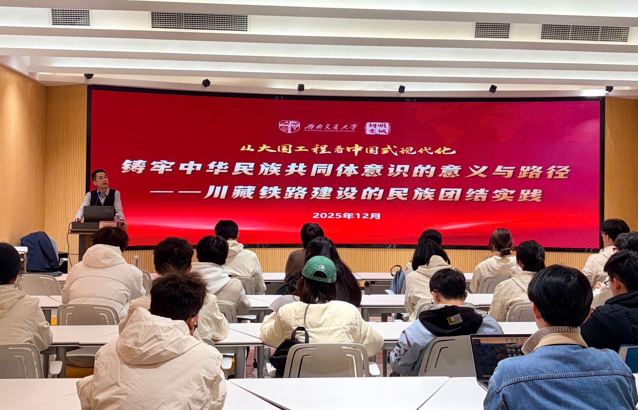 为深入学习贯彻习近平总书记关于铸牢中华民族共同体意识的重要论述,引导青年学子深刻理解新时代民族工作的核心要义,2025年12月2日晚,由党委宣传部主办、地球科学与工程学院承办的“明诚讲堂”从大国工程看中国式现代化专题讲座在犀浦校区K8教学楼拉开序幕。本次讲座特邀马克思主义学院王浩宇老师,讲座题目为《铸牢中华民族共同体意识的意义与路径——从CZ铁路看民族团结的时代实践》,校内20多个学院的80余名师生参与本次活动。