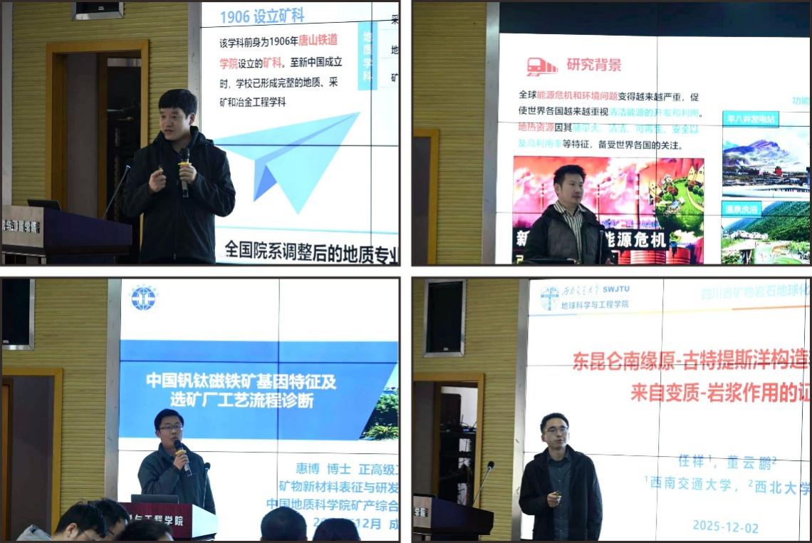 会议第二阶段为学术报告会,由学会副理事长、西南交通大学赵晓彦教授主持。赵晓彦教授首先从学科总体情况、研究方向与内容、学科平台三个方面系统介绍了我校地质学科的发展现状。随后,西南交通大学张云辉副教授作了题为“青藏高原深大断裂带地热成因研究进展”的学术报告,重点阐述了地热流体的地球化学特征与数值模拟方面的最新成果;中国地质科学院矿产综合利用研究所惠博正高级工程师以“中国钒钛磁铁矿基因特征及选矿厂工艺流程诊断”为题,从研究背景、矿石基因特征及工艺流程诊断案例等方面展开,研究内容前沿、方法丰富,并对未来合作方向进行了展望;西南交通大学任祥博士后作了题为“东昆仑南缘原-古特提斯洋构造转换关系:来自变质-岩浆作用的证据”的报告,围绕原-古特提斯洋构造转换这一科学问题,基于对东昆仑造山带苦海岩群的精细研究,展示了该领域的最新进展。