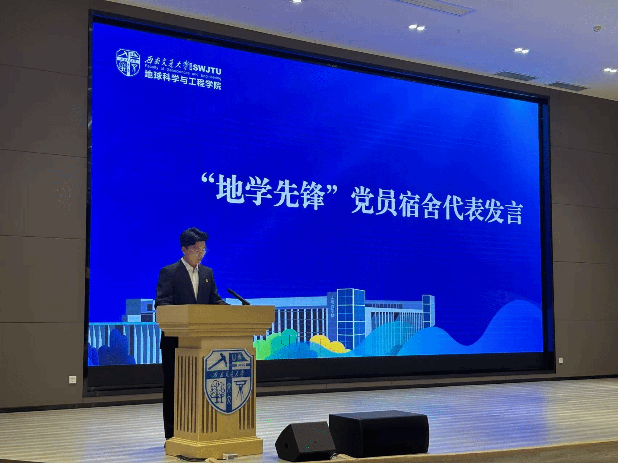 学院园区第一特设党支部书记廖望同学作为“地学先锋”党员宿舍代表发言。廖望同学号召全体学生党员在学生宿舍中主动亮明党员身份,多做一点、多走一步、多想一分,在服务同学中体现党员价值,在平凡岗位上展现责任担当。