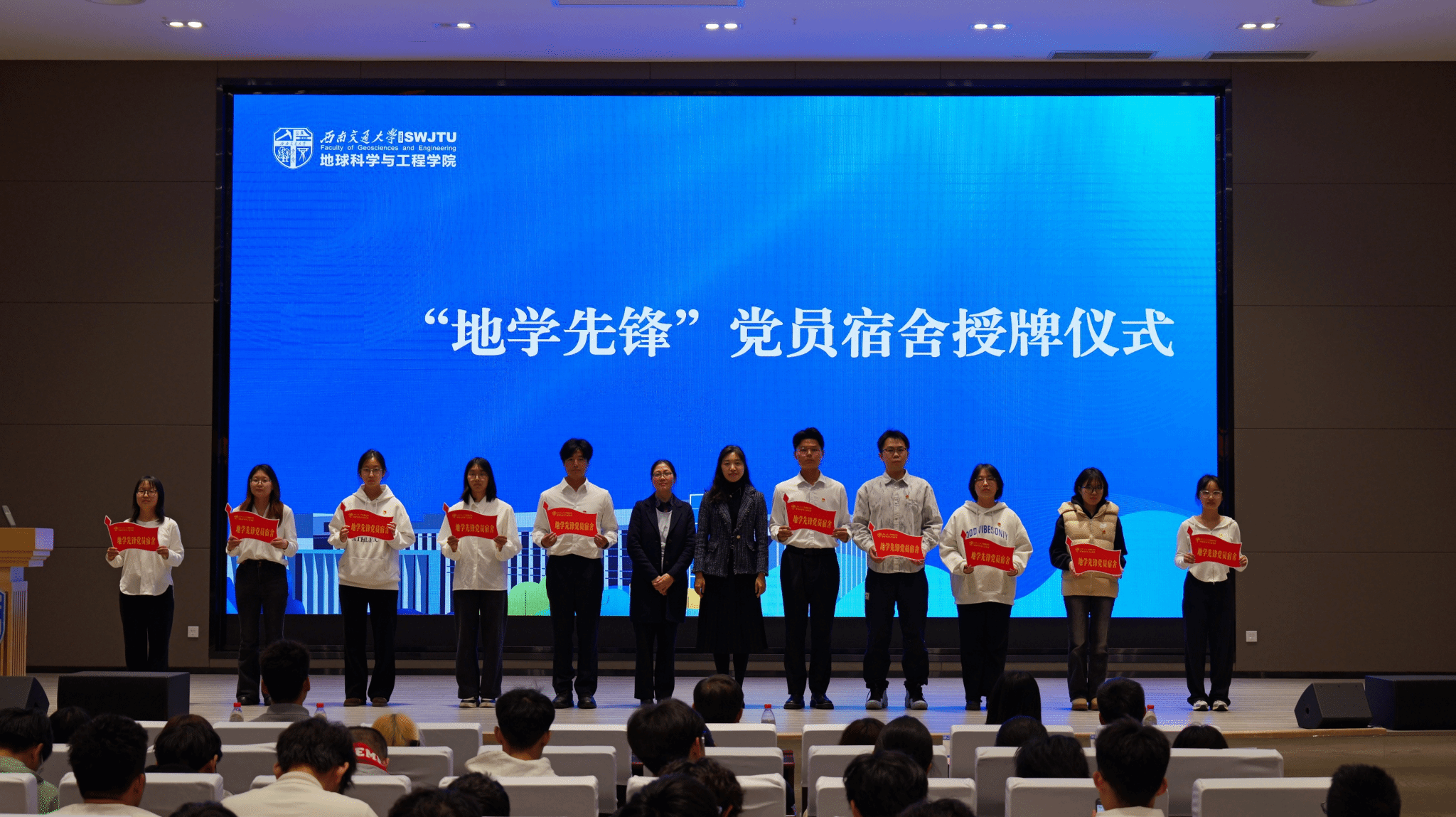 为进一步发挥党建引领作用,会议为“地学先锋”党员宿舍授牌。党委学生工作部副部长谢力和学院党委副书记曾洁为党员宿舍代表授牌。